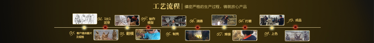 制作一件完美的鑄銅雕塑,最重要的步驟就是制作泥塑模型,然后再用工業(yè)硅膠拓印、翻模。所以泥塑的姿態(tài)、神情生動(dòng)與否直接影響最終銅雕塑的品質(zhì)。所以我廠一直對泥塑模型的制作格外重視。我廠以雕塑為本,以藝術(shù)為根,挾中華文化之傳統(tǒng),偕歐陸藝術(shù)之風(fēng)韻,風(fēng)格獨(dú)特,盡顯淋漓盡致。我們本著大膽創(chuàng)新、勇于突破的精神,以追求卓越為導(dǎo)向,堅(jiān)持寧缺勿濫為原則,并可依照您提供的要求,為您量身設(shè)計(jì)制作。我廠人才濟(jì)濟(jì),有智慧嚴(yán)謹(jǐn)?shù)墓芾戆嘧樱姸嗄贻p充滿激情、充滿創(chuàng)意的專業(yè)設(shè)計(jì)團(tuán)隊(duì)、有專業(yè)技術(shù)精湛的雕塑制作人才和專業(yè)的施工隊(duì)伍。他們不僅具深厚的文化藝術(shù)底蘊(yùn),更汲取當(dāng)代雕塑精華,博采眾家之長,作品既有嚴(yán)肅莊重寫實(shí)題材,也有輕松前衛(wèi)的抽象題材,表現(xiàn)手法上浪漫主義中不乏樸實(shí),現(xiàn)實(shí)主義中蘊(yùn)涵著激情,設(shè)計(jì)理念貫穿古今、融匯中西,深刻詮釋著藝術(shù)的精髓,把古典主義和后現(xiàn)代主義完美的融合,將雕塑藝術(shù)演繹為力的凝聚、美的體現(xiàn),讓人們感受到的不僅是一種藝術(shù)的浪漫與優(yōu)雅、粗獷與悲壯、更是豐富的優(yōu)秀藝術(shù)寶藏和文化傳統(tǒng),讓您在藝術(shù)與文化中穿流,在時(shí)空中飄蕩,使靈魂在藝術(shù)的海洋洗禮。 MORE+